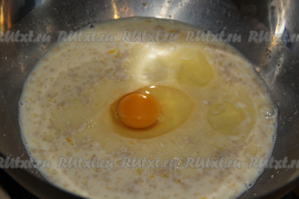 По прошествии 15 минут добавить к опаре яйца и слегка перемешать венчиком.