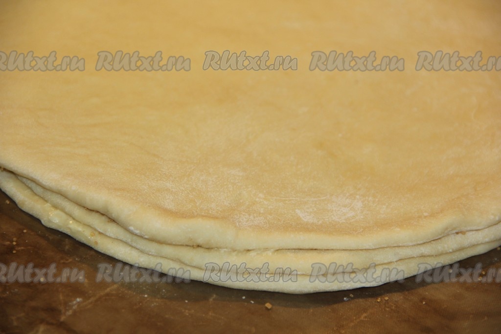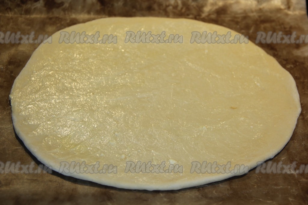 Круг теста выложить на противень, застеленный пергаментом (или тефлоновым ковриком). Смазать круг 10 граммами размягчённого сливочного масла.