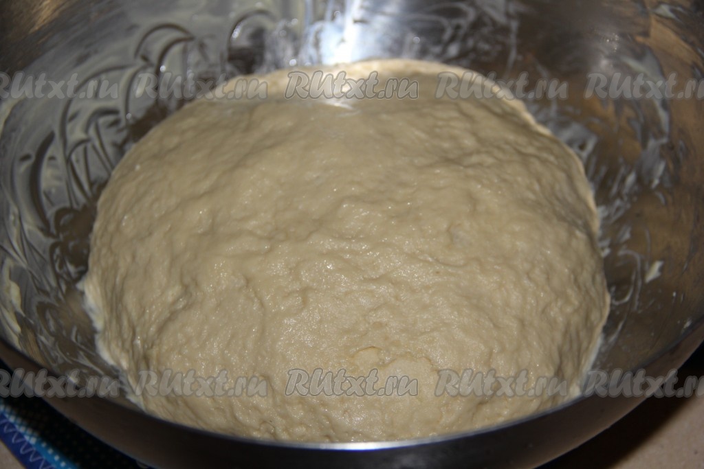 Вымесить тесто в течение 15-20 минут. Сначала тесто будет липнуть, а затем станет очень пластичным и эластичным. Оставить дрожжевое тесто в миске, накрыв полотенцем для подъёма. Оно должно увеличиться раза в 2-3 (у меня тесто поднялось на кухонном столе за 1,5 часа).