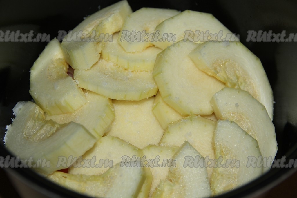 Выложить кабачки поверх овощей, посолить, по желанию, можно добавить немного молотого чёрного перца.