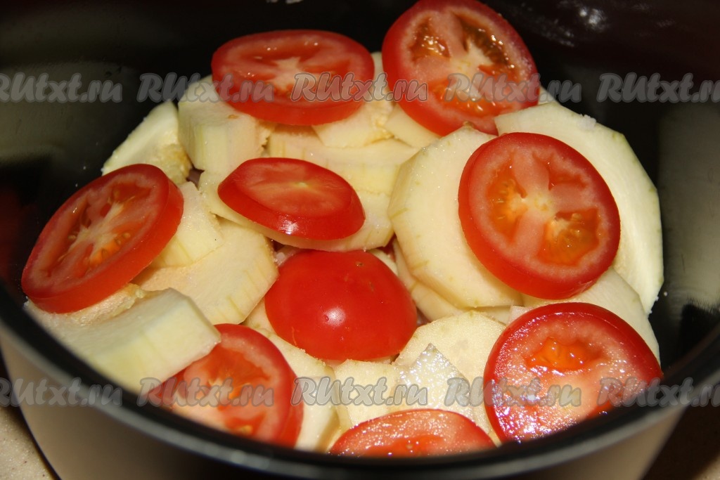 Помидоры вымыть, нарезать на кружочки и выложить поверх кабачка.