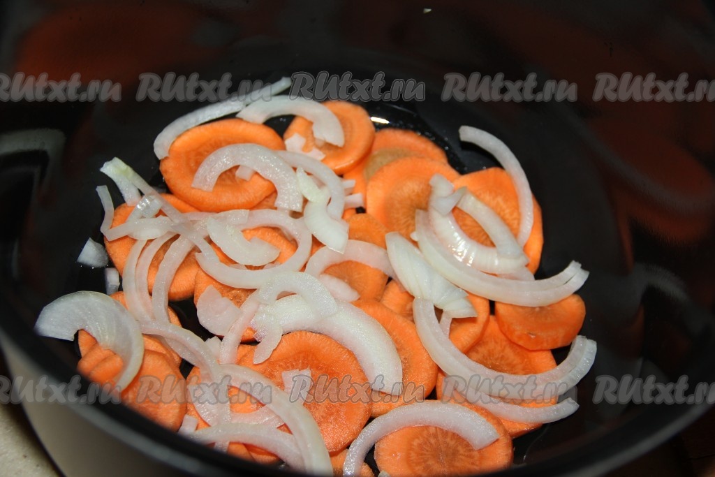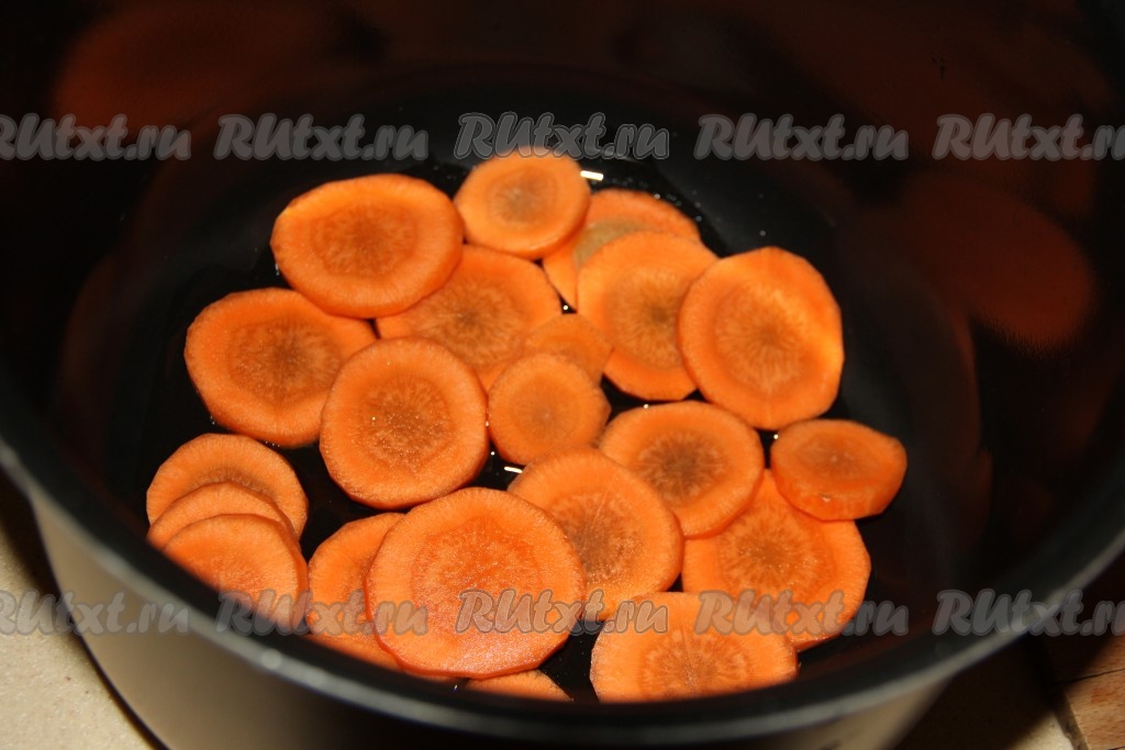 В чашу мультиварки влить, примерно, 2 столовые ложки масла и выложить слой моркови.