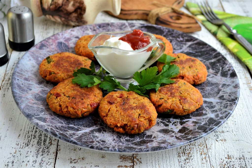 Подавать необычные, вкусные, хрустящие постные котлеты, приготовленные из красной чечевицы, в тёплом виде с соусами.