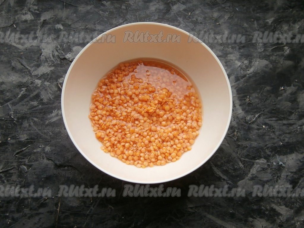 Красную чечевицу полностью залить водой комнатной температуры, перемешать и оставить на 1 час.