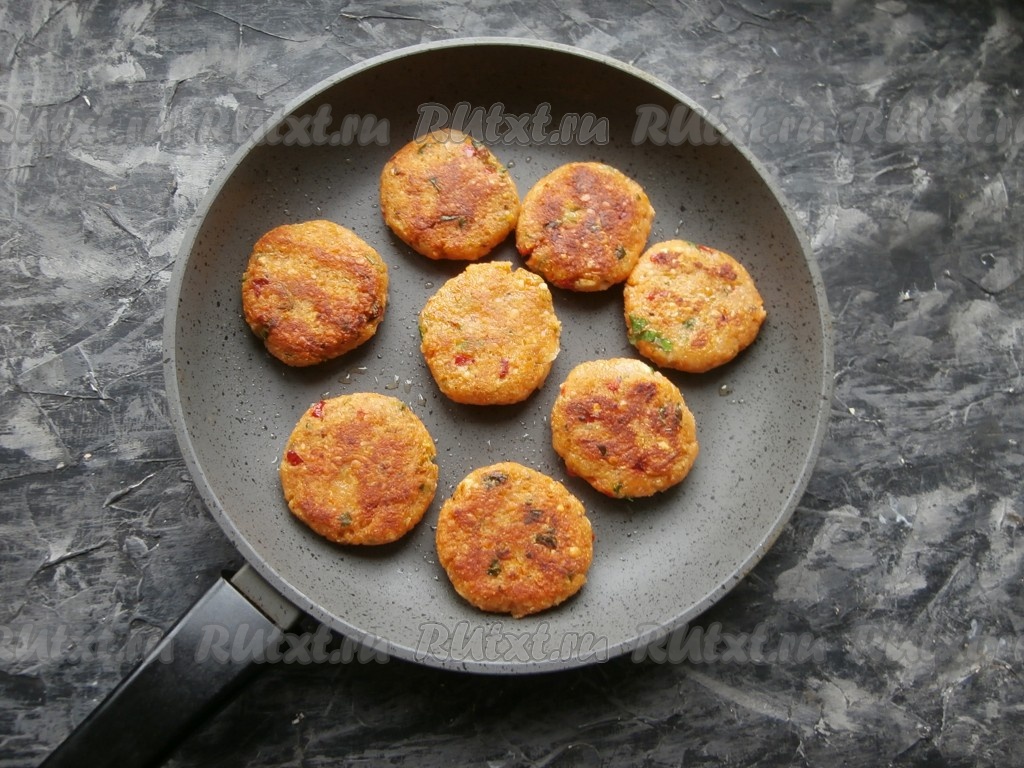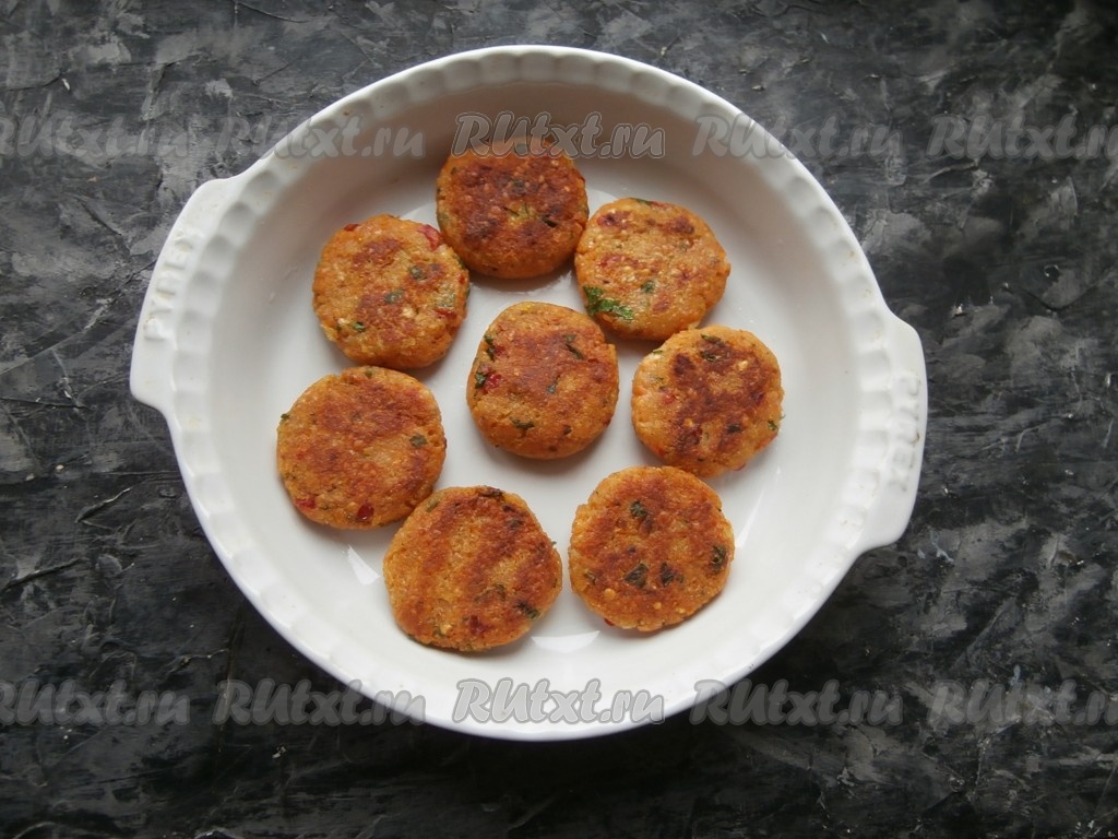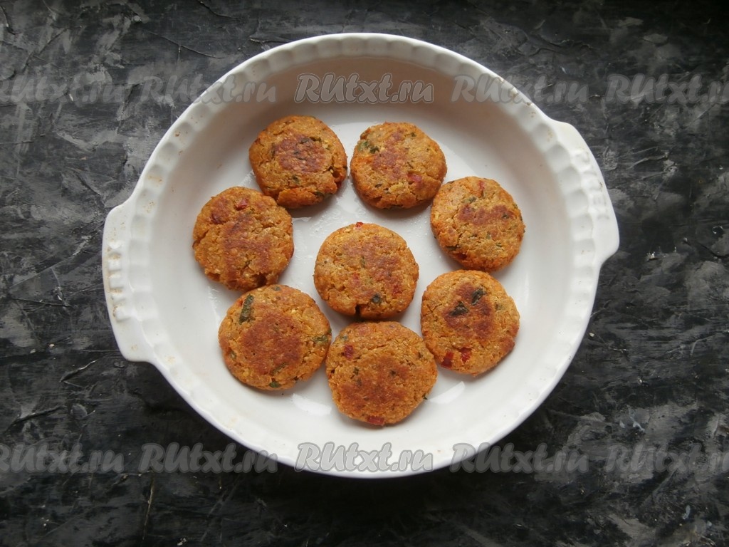 На сковороде разогреть 1,5-2 столовые ложки растительного масла, обжарить котлеты из красной чечевицы на среднем огне до небольшой румяности с двух сторон.