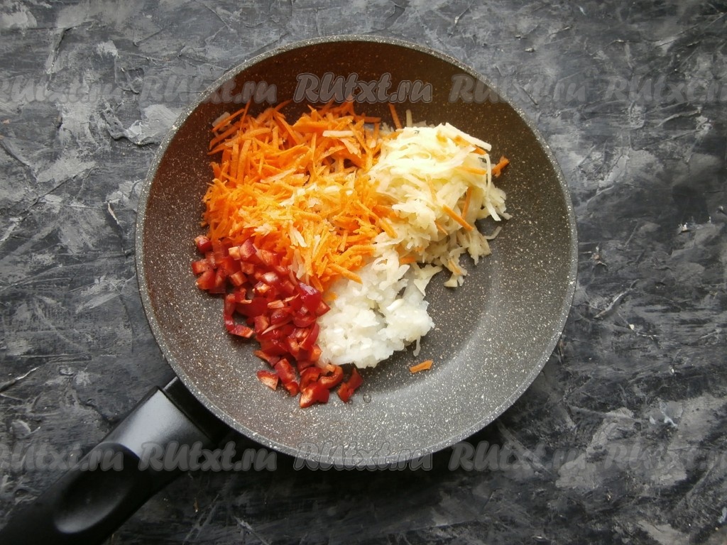 Лук, морковь и картофель очистить, натереть на средней тёрке. Болгарский перец, очищенный от семян, нарезать маленькими кубиками. Поместить натёртые морковь, картошку, лук и нарезанный перец в сковороду, влить 1 столовую ложку растительного масла.