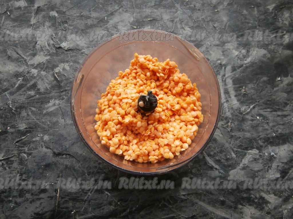 Измельчить чечевицу с хлебом до состояния мелкой, липкой крошки.