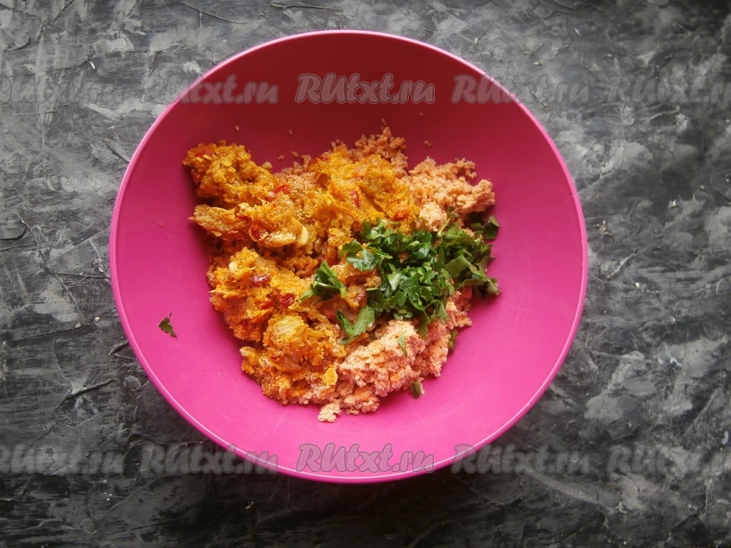 Переложить крошку из чечевицы и хлеба в миску, добавить овощную смесь вместе с рубленной петрушкой.