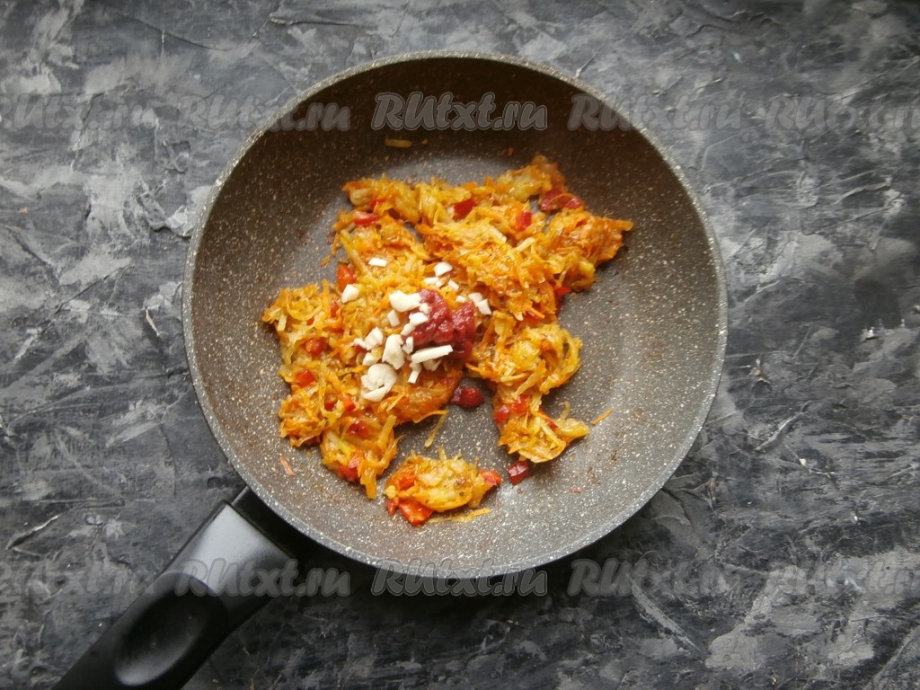Перемешать и на небольшом огне, часто помешивая, протушить овощи до мягкости (ещё 5-6 минут). Затем добавить томатную пасту и мелко нарезанный чеснок.