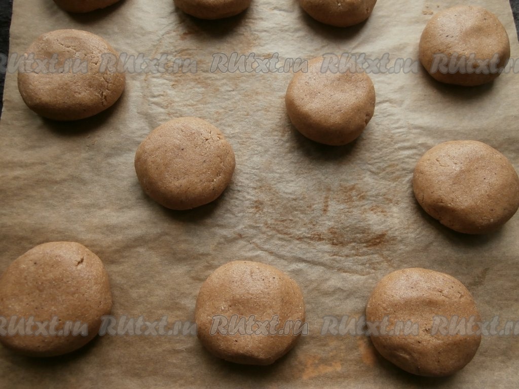 Тесто разделить на 10-11 частей и немного влажными руками скатать шарики, выложить их на противень, застеленный пергаментом, на расстоянии друг от друга около 5-6 см. Шарики немного придавить рукой.