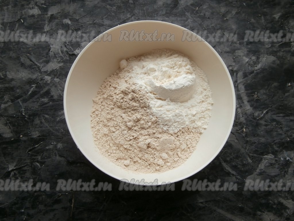 К овсяной муке добавить пшеничную муку высшего сорта, перемешать.