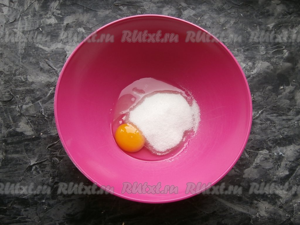 В миску разбить яйцо, всыпать сахар, ванильный сахар и соль.