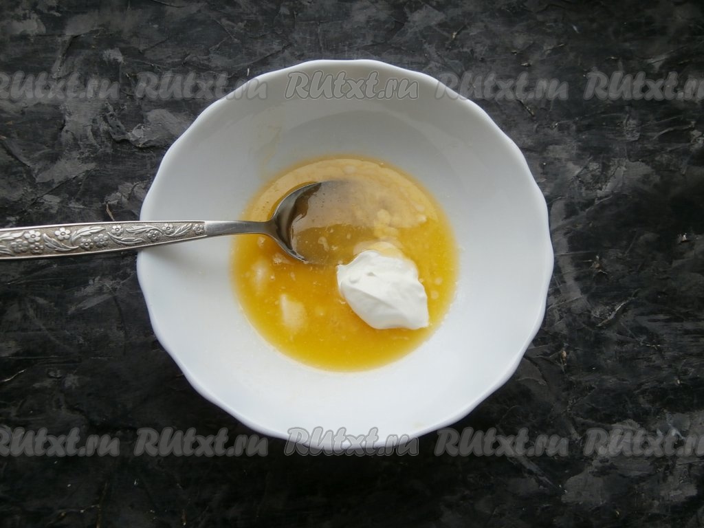 Сливочное масло растопить в микроволновке (или на плите), остудить до тёплого состояния. К тёплому маслу добавить сметану и жидкий мед, перемешать масляную смесь до однородности.