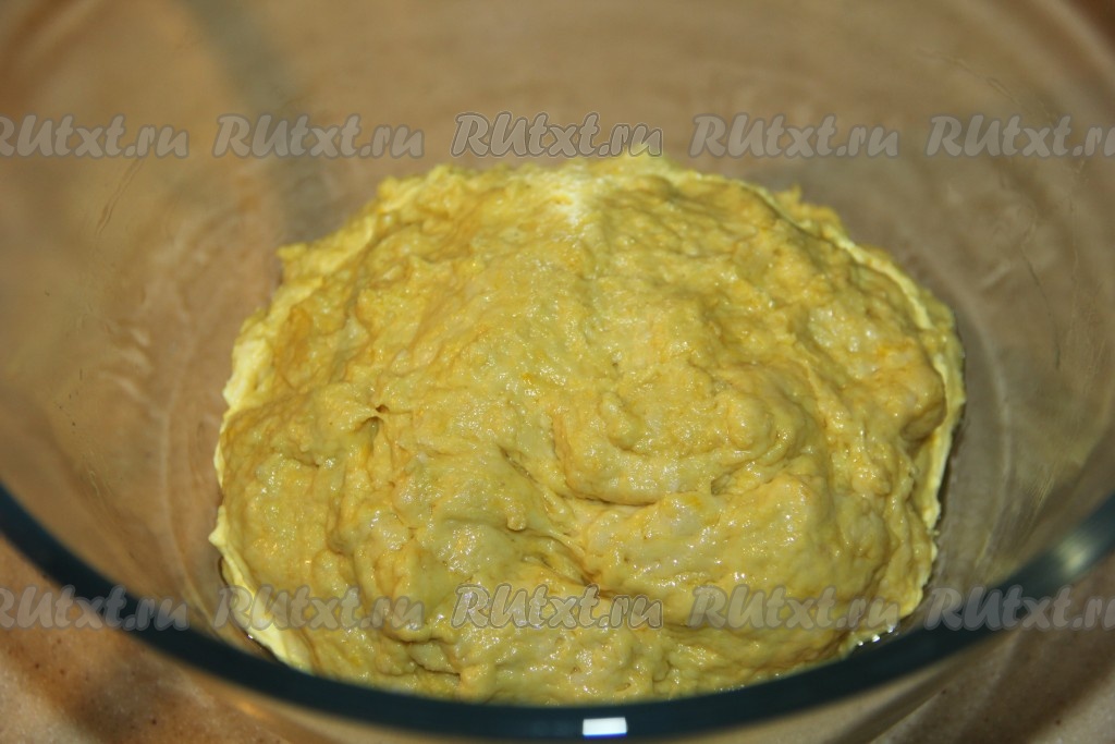 Влить опару и замесить тесто. Я замешивала тесто венчиком. Тесто получится липким, оставить его в миске, накрыть пищевой плёнкой и поставить в тепло на 1 час.
