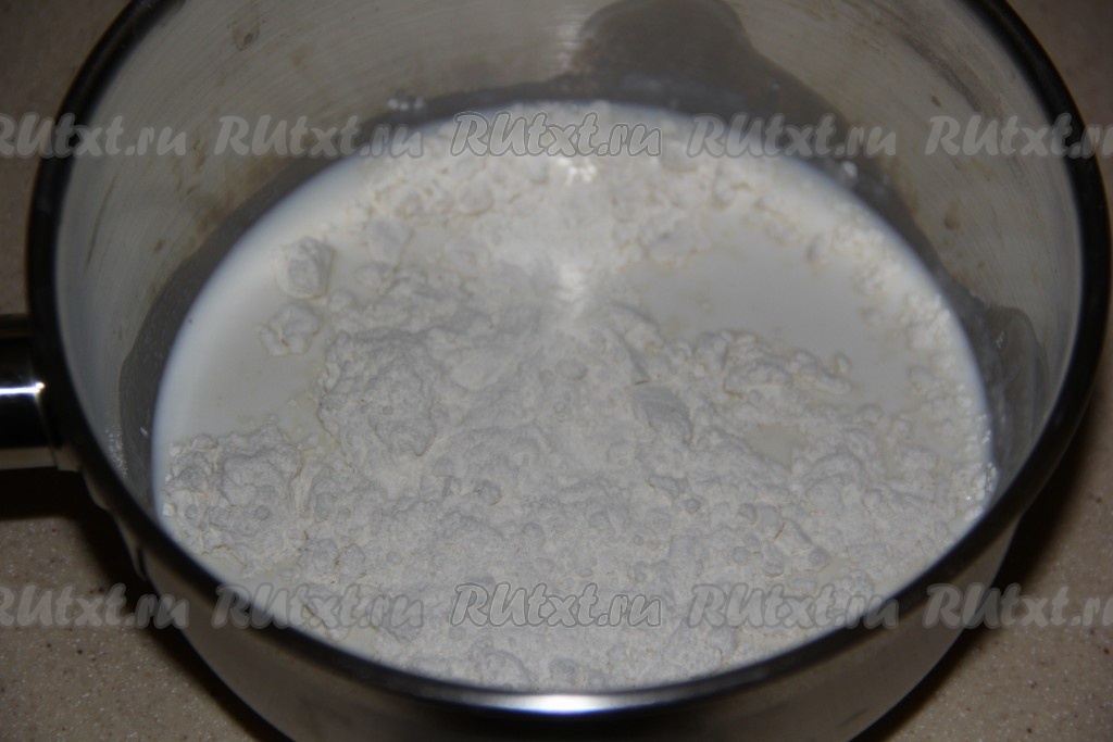 Для приготовления заварной смеси "танджонг" в отдельном ковшике нужно соединить молоко и муку, перемешать венчиком.