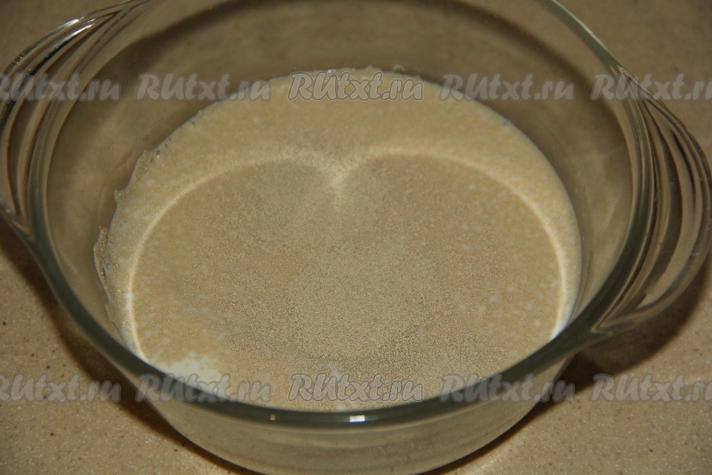 Сперва сделаем опару, для этого в достаточно глубокой миске нужно соединить тёплое молоко (молоко сильно не нагревайте, его температура не должна быть более 40 градусов), сахар и сухие дрожжи, перемешать. Оставить опару в тепле минут на 15.