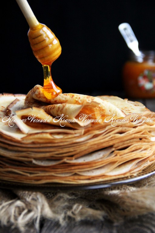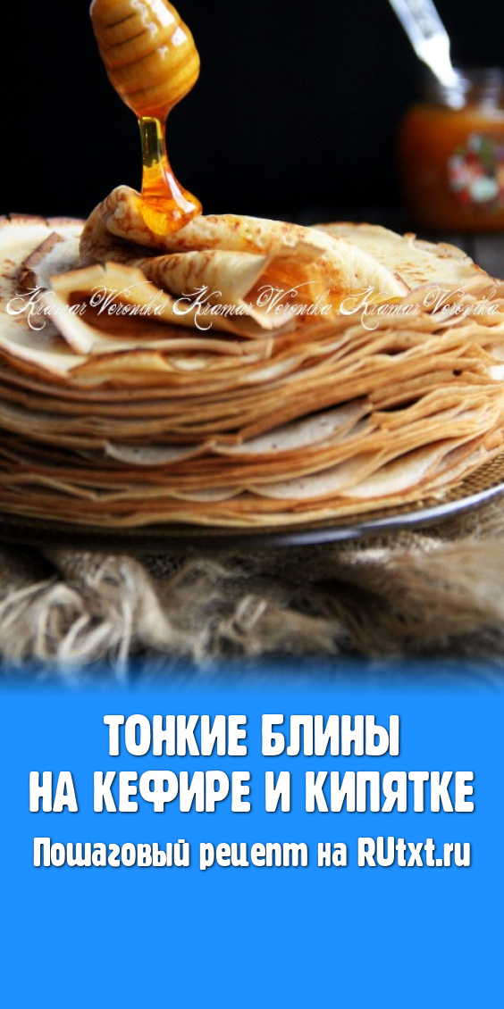 Нежные, тонкие, вкусные блины, замешанные на кефире и кипятке, к столу подать с мёдом, сметаной или вареньем.
