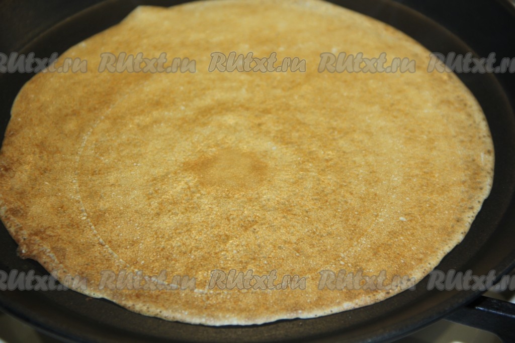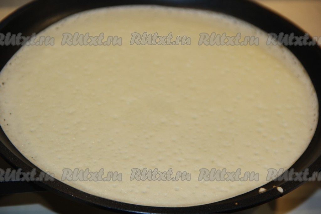 Очень хорошо разогреть сковороду, слегка смазать растительным маслом. Влить половник блинного теста в сковороду и равномерно распределить по всему дну сковородки.