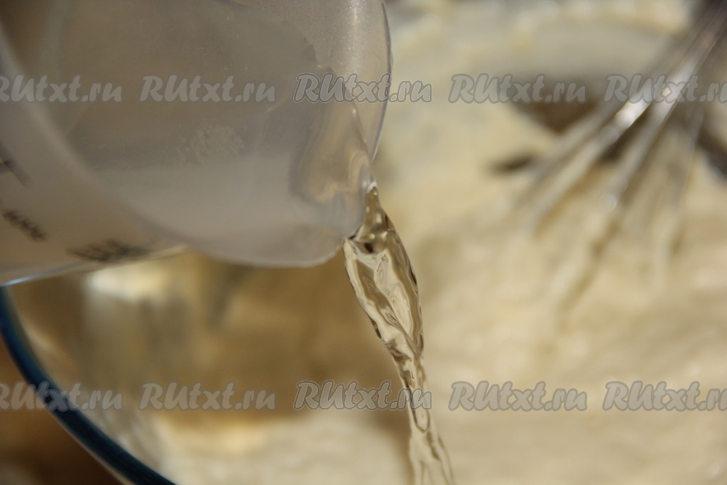 Влить в тесто тонкой струйкой кипяток, смешанный с содой, постоянно перемешивая венчиком.
