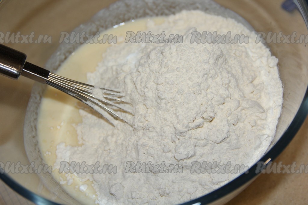 Затем в смесь кефира и яиц всыпать муку, очень хорошо перемешать.