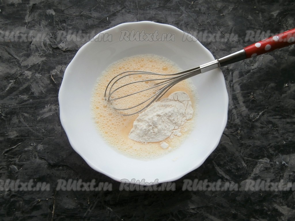 Хорошо взбить молочно-яичную смесь венчиком, всыпать муку.