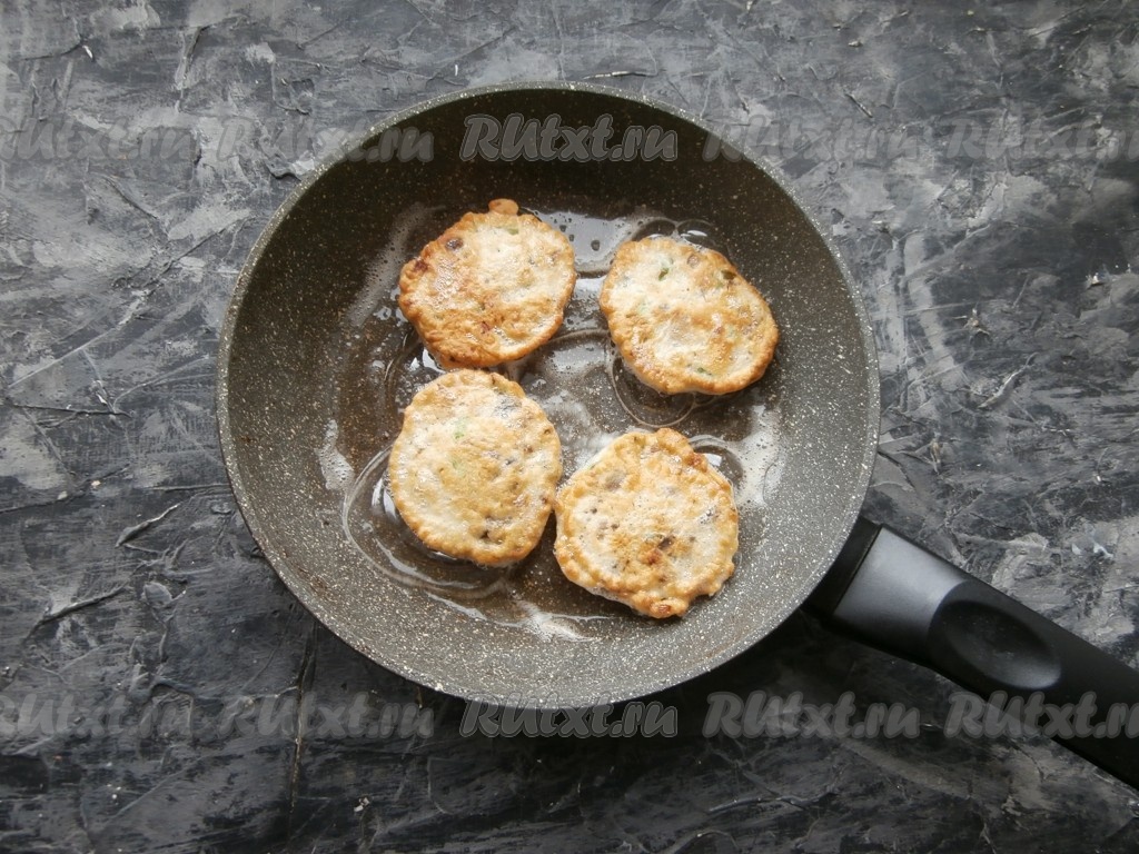 Грибные оладьи жарить на среднем огне до румяного вида с двух сторон.