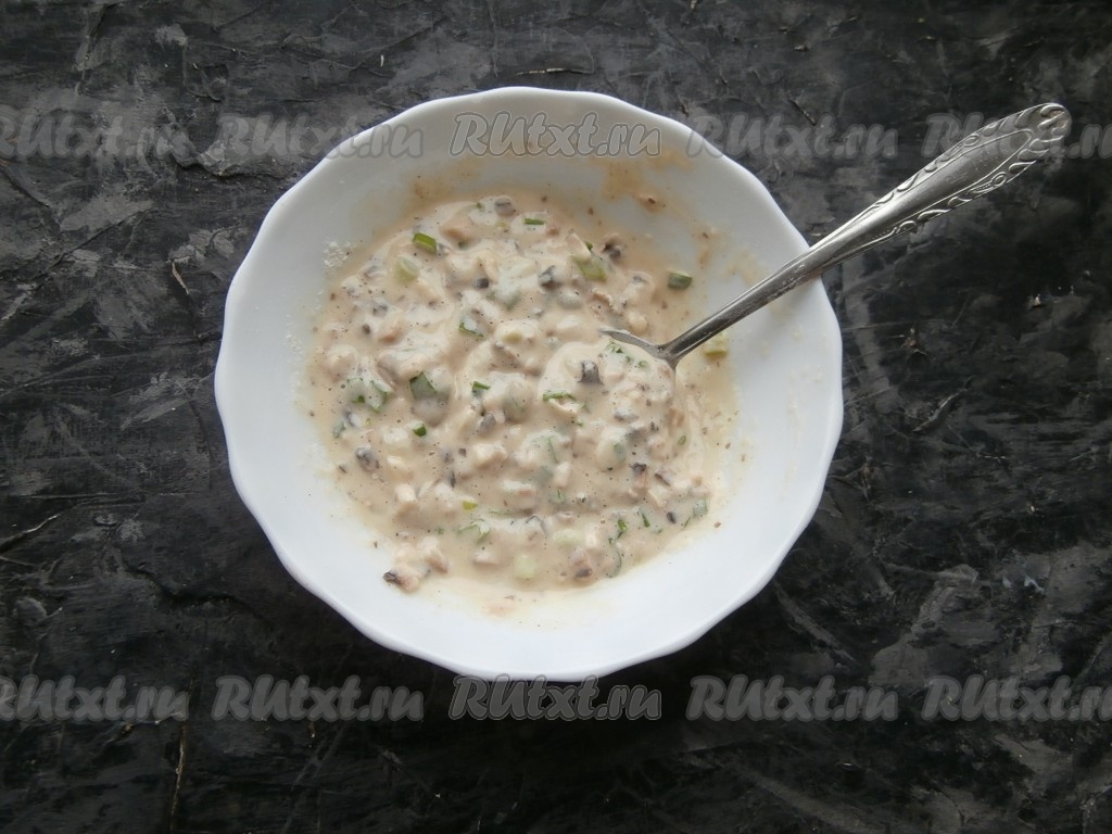 Должно получиться тесто, по консистенции похожее на сметану. Далее добавить в тесто мелко нарезанные свежие шампиньоны (или предварительно отваренные лесные грибочки), измельчённый зелёный лук и всыпать по вкусу чёрный молотый перец.