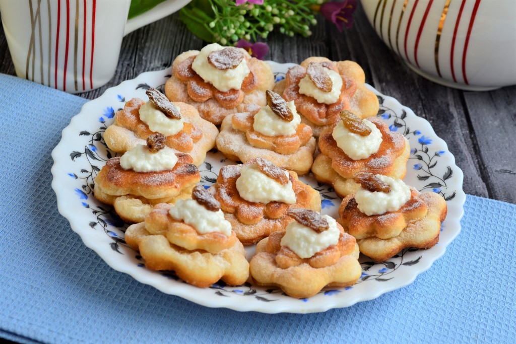 Если в твороге большие крупинки, можно всю массу немного измельчить погружным блендером. Творожную массу переложить в кондитерский мешок, срезать кончик и выдавить её в серединку пончиков на маленький цветок. На творожной начинке разместить по ягодке изюма.