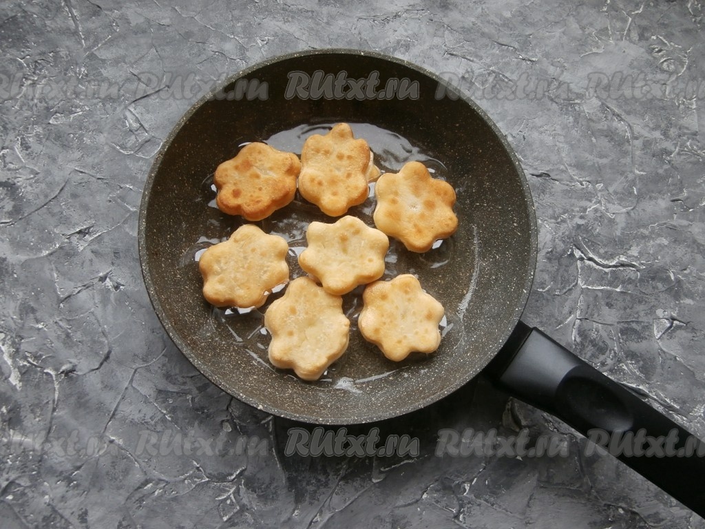 Когда снизу пончики станут румяными, перевернуть их и зарумянить с другой стороны. При этом меньшие цветочки должны распахнуться и раскрыться. Жарятся пончики быстро.
