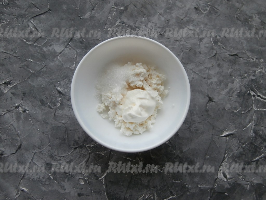 Теперь приготовим начинку, для этого творог нужно смешать со сметаной и сахаром.