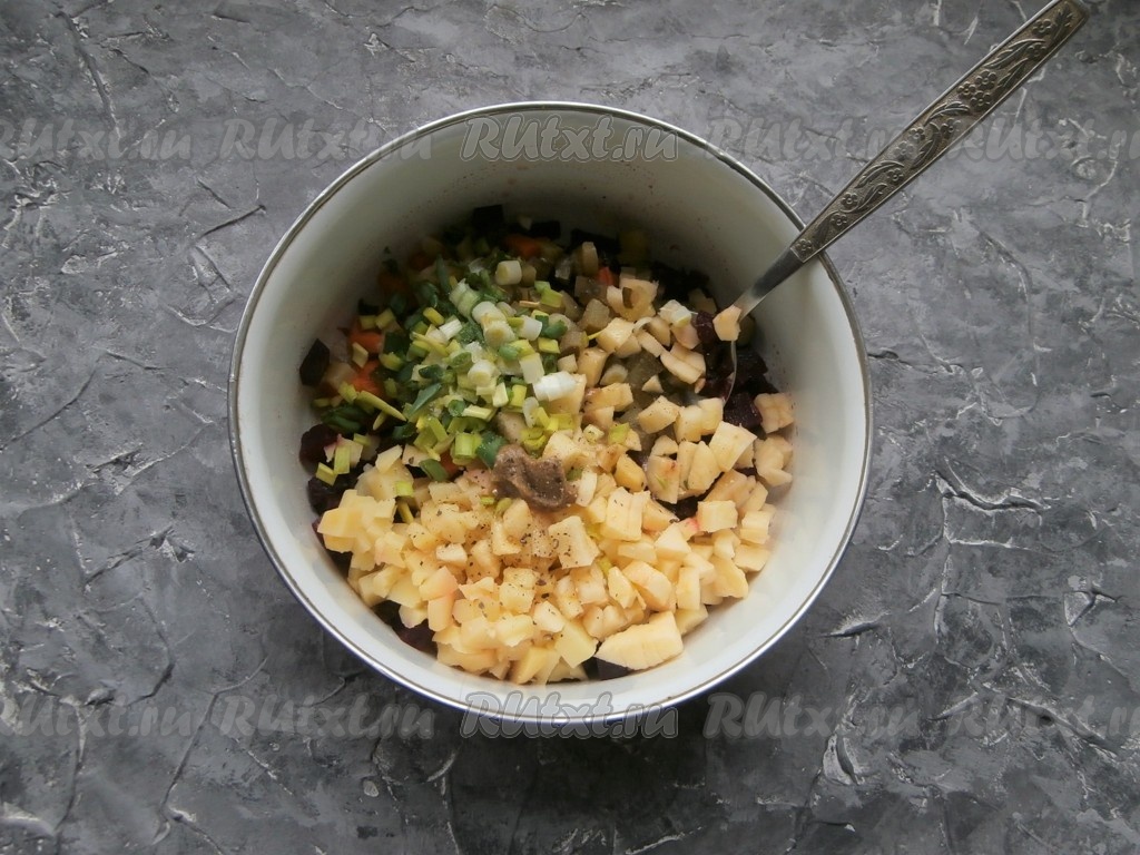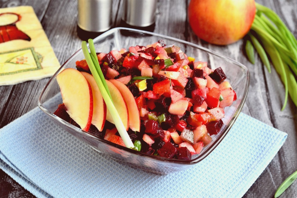 Дать очень вкусному винегрету, приготовленному с яблоком, немного настояться в холодильнике и можно подавать к столу.
