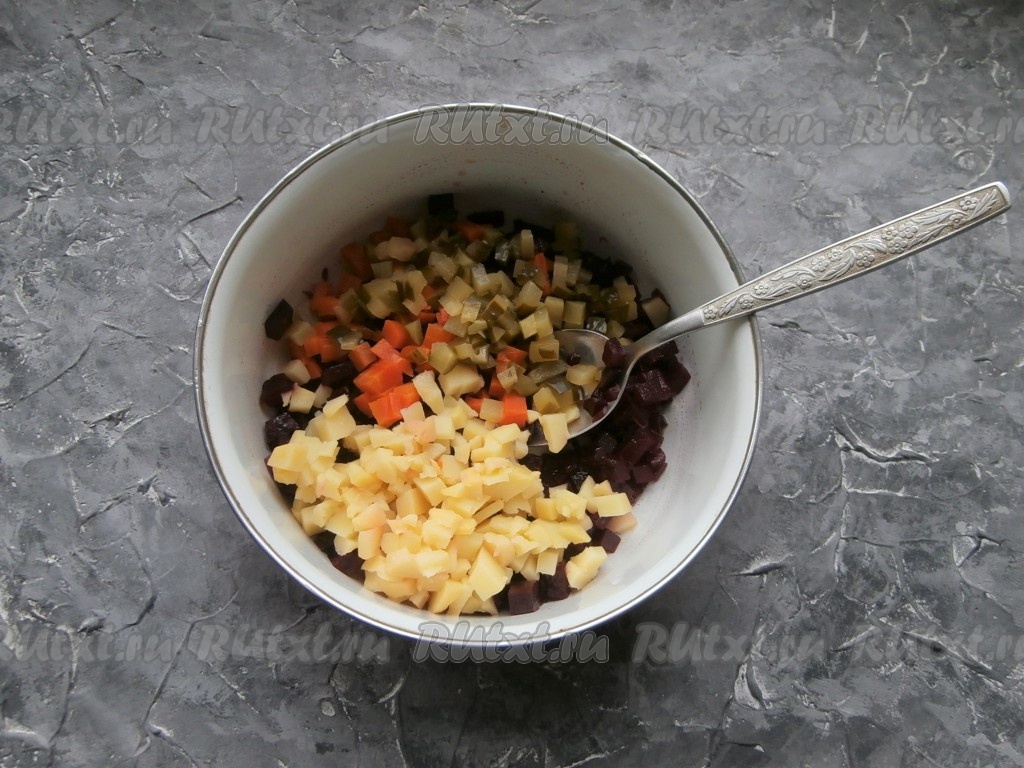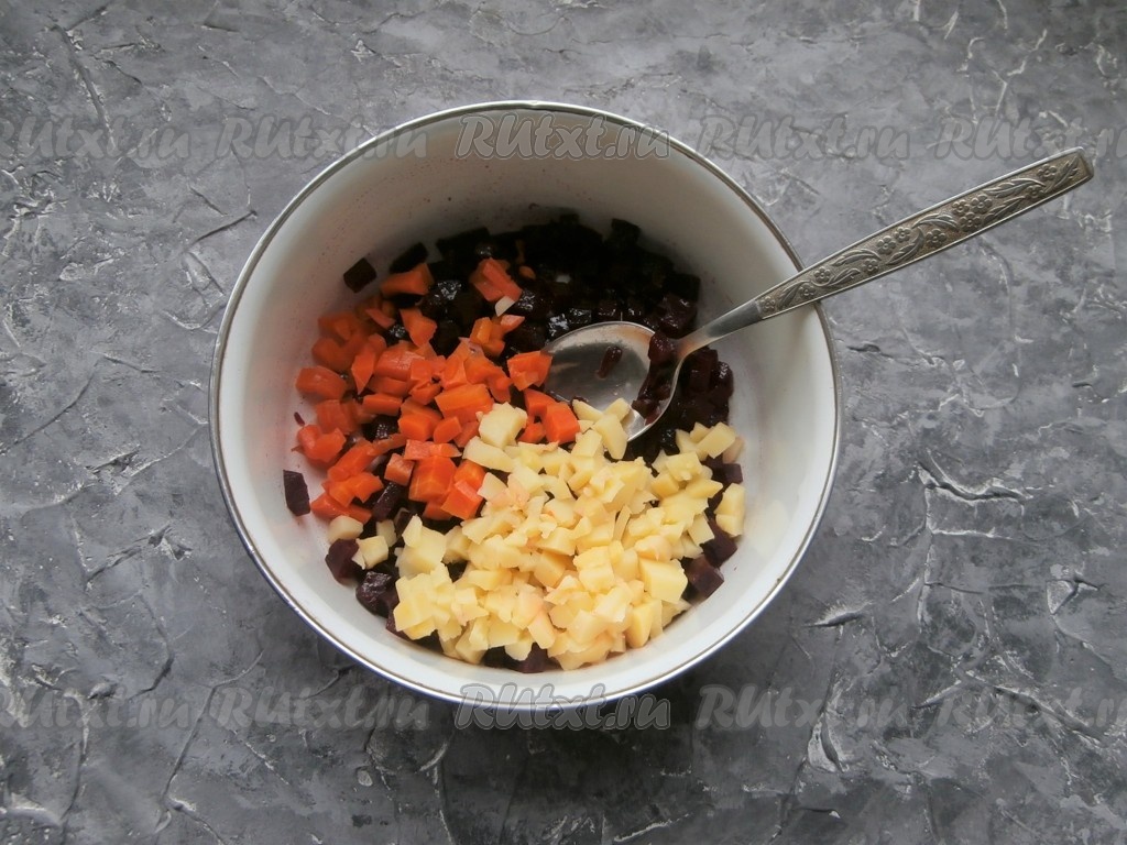 Картофель, свеклу и морковь, не очищая от кожуры, предварительно отварить и остудить. Свекла варится около 50-60 минут, картофель и морковь - 25-30 минут. Продолжительность варки зависит и от размера, и от сорта овощей, готовые корнеплоды должны хорошо прокалываться ножом. Отваренные овощи очистить. Свеклу нарезать небольшими кубиками, выложить в миску, влить часть подсолнечного масла, перемешать (смешивание свеклы с частью масла не позволит в дальнейшем свекле сильно окрасить все составляющие винегрета).
