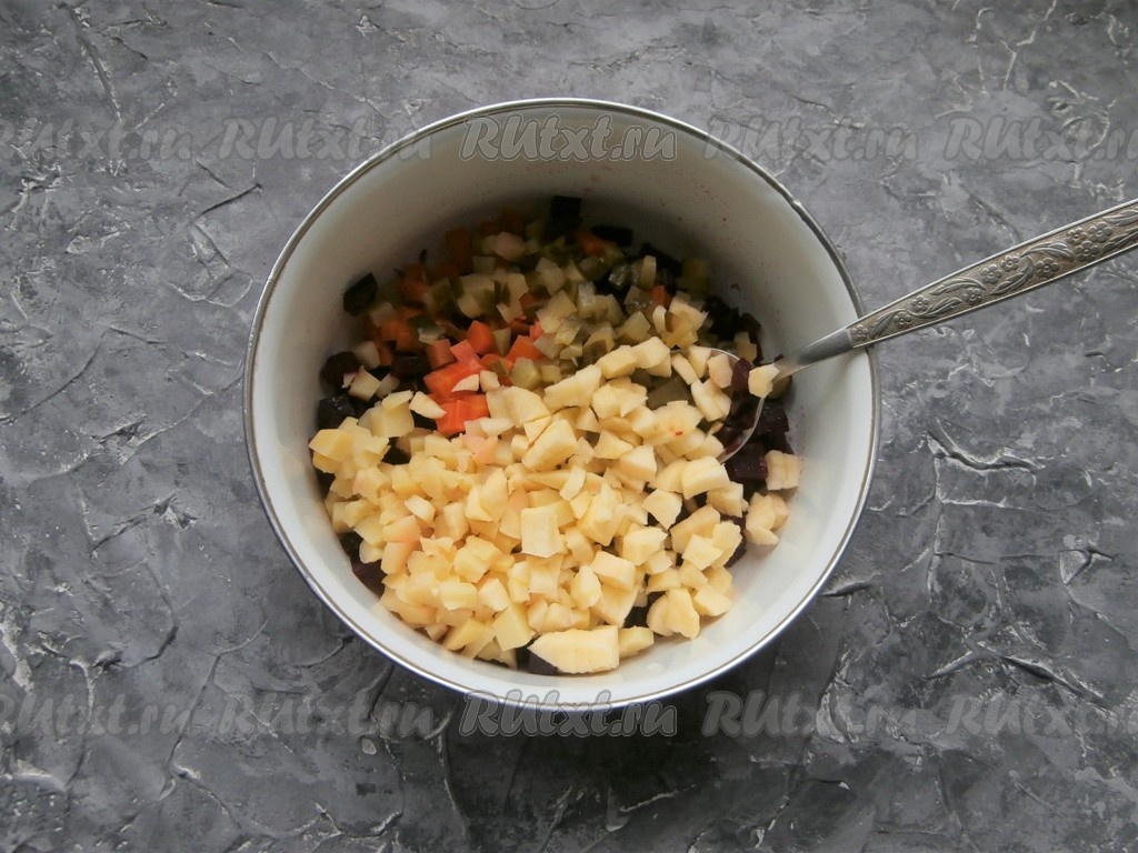 Влить подсолнечное масло и винегрет перемешать.