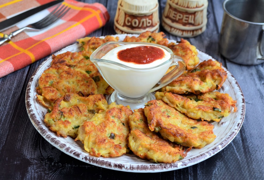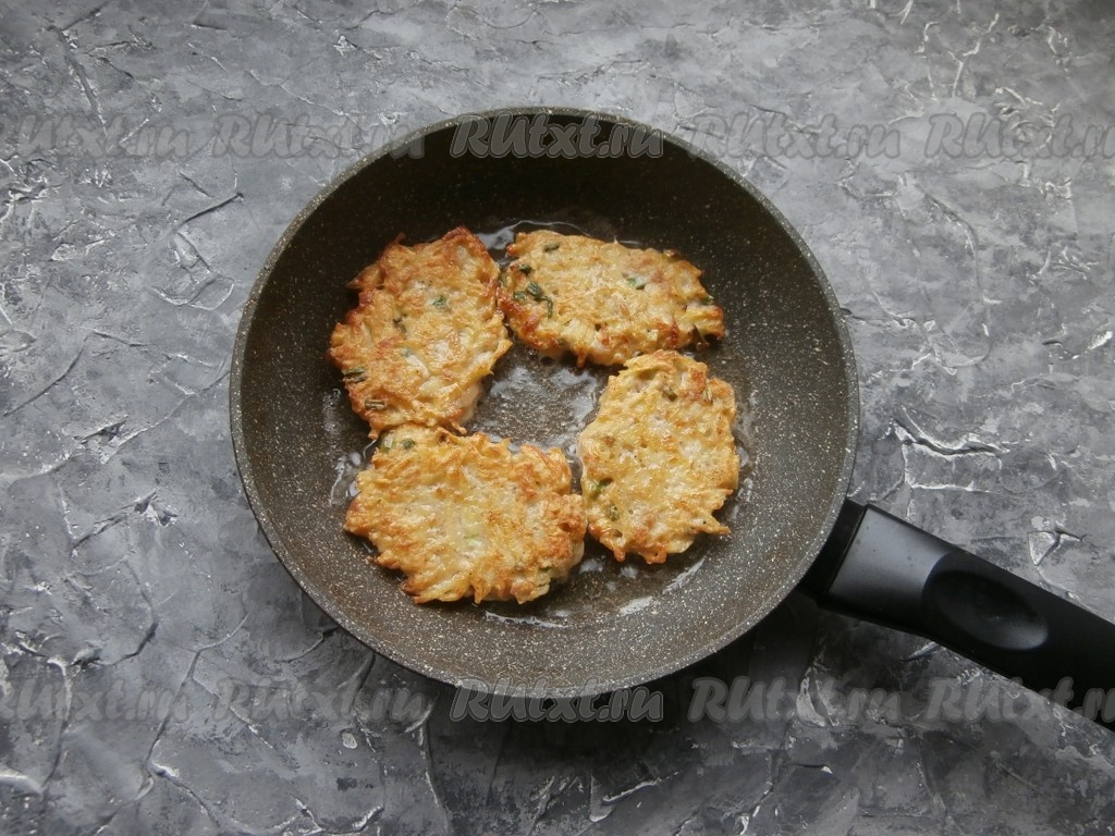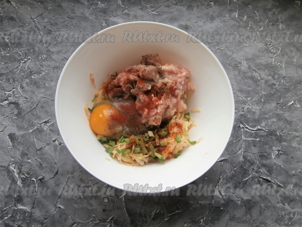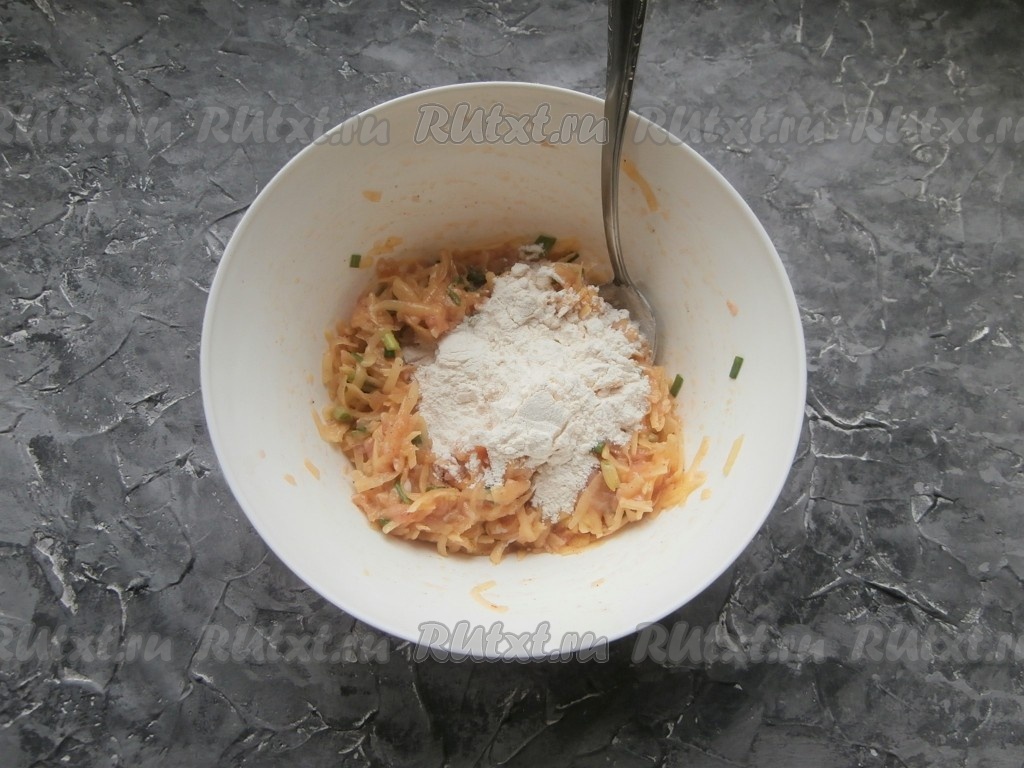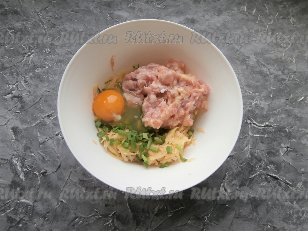 Картофель очистить, помыть, натереть на крупной тёрке, немного отжать, добавить мелко нарезанный зелёный лук.