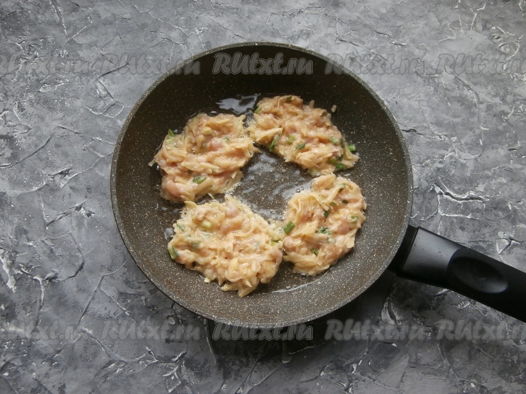 Сковороду разогреть с растительным маслом и выкладывать картофельно-мясную массу ложкой в виде оладий-драников.