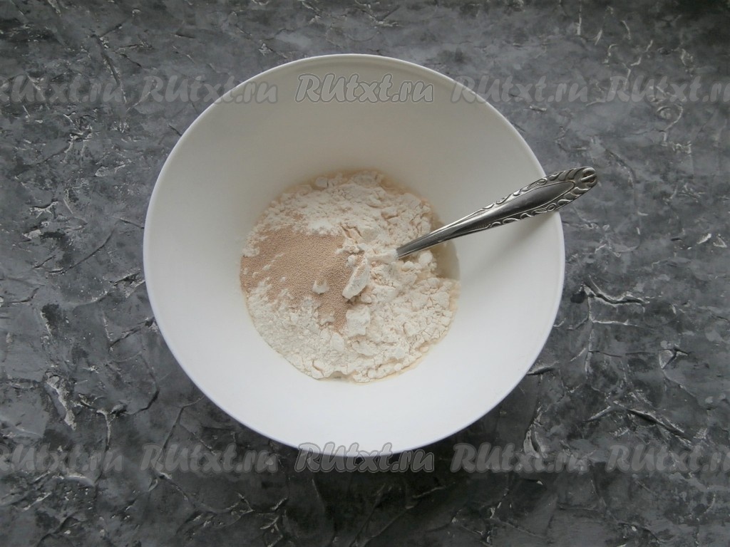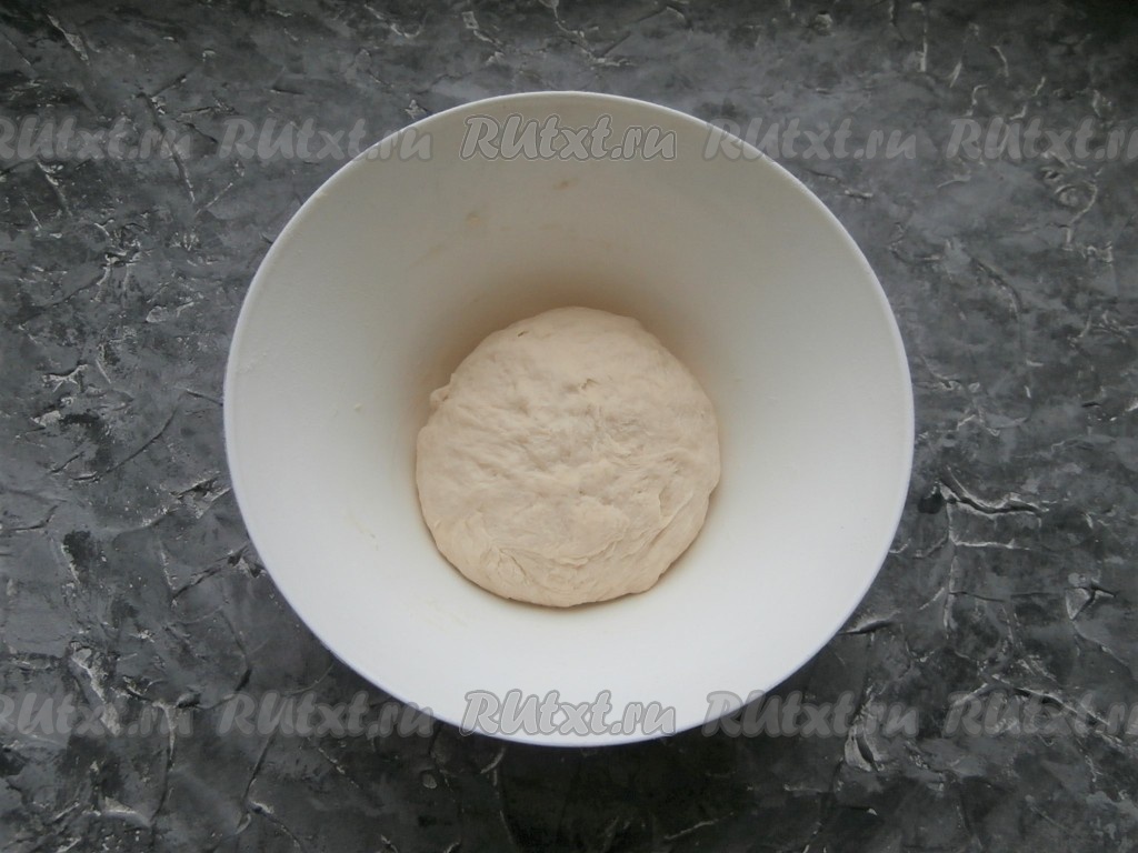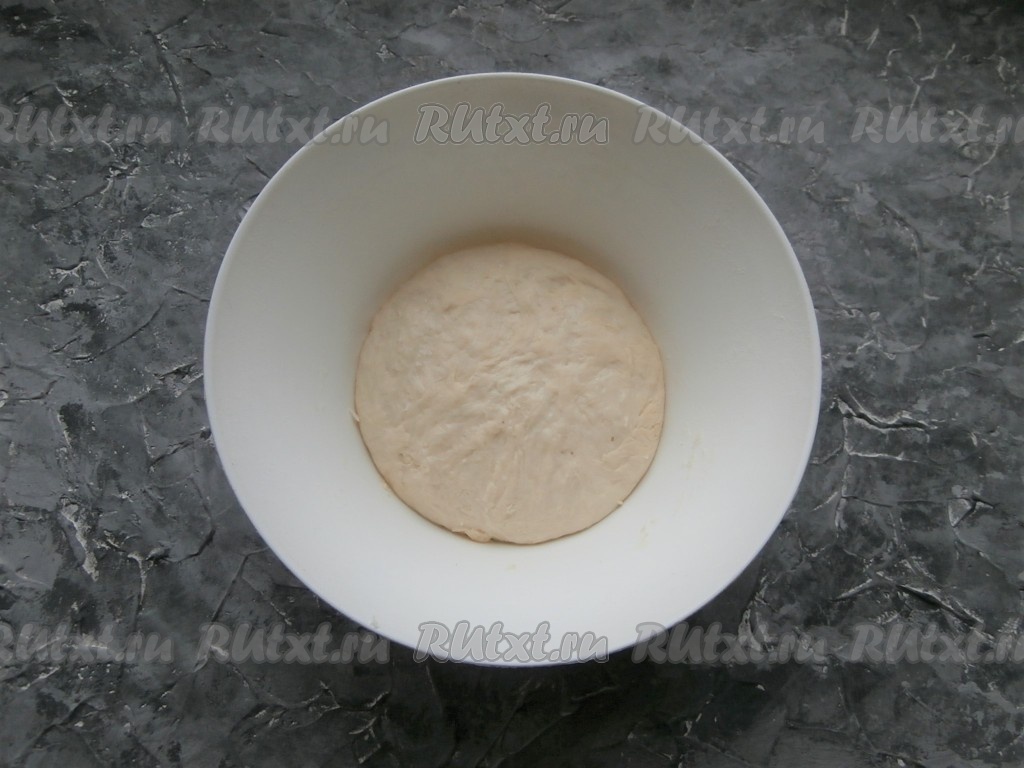 Замесить не липнущее, но мягкое тесто. Поместить тесто в миску, которую нужно сверху прикрыть плёнкой, и оставить в тёплом месте на 40 минут.