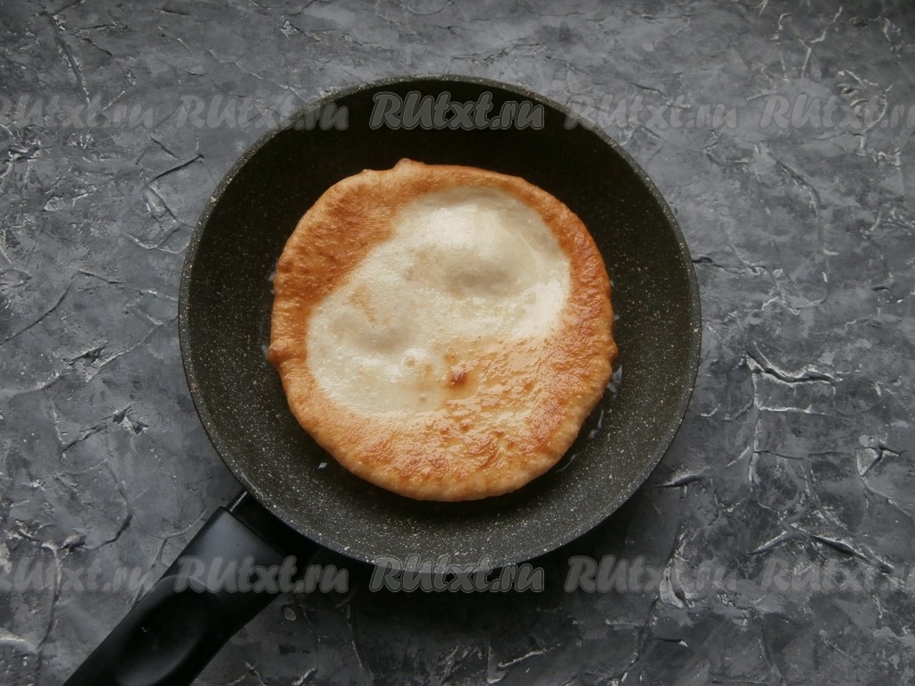 Жарить лепёшку на среднем огне до румяности, далее перевернуть и жарить до румяного цвета с другой стороны, затем переложить на тарелку. Аналогично пожарить оставшиеся 3 лепёшки.
