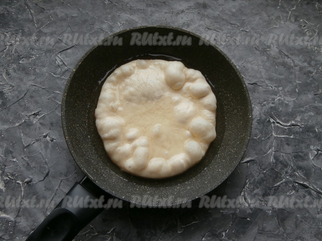 Также раскатать и остальные части теста. Сковороду разогреть с достаточным количеством растительного масла, выложить лепёшку.
