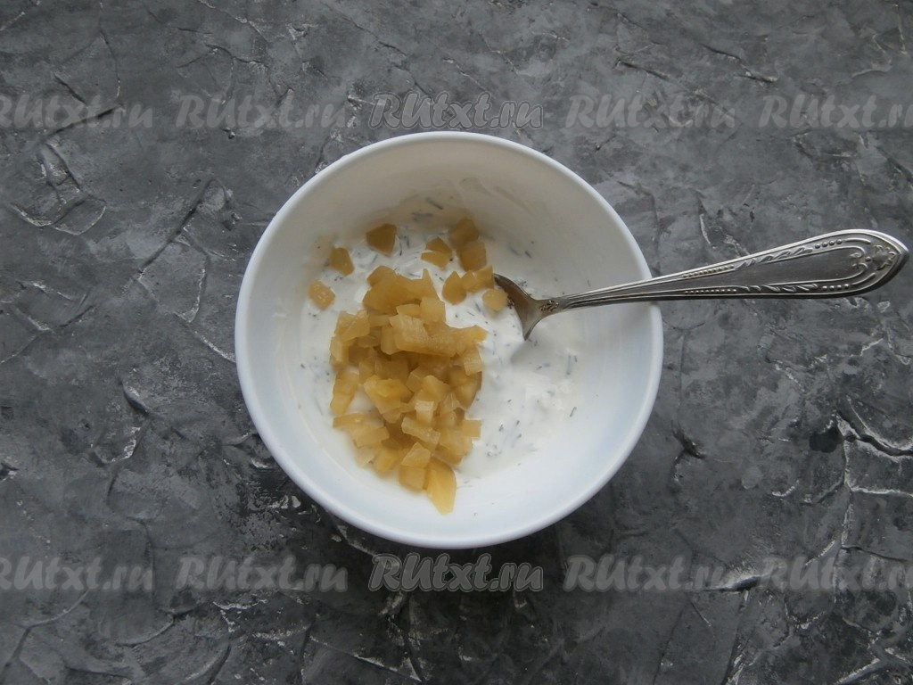 Добавить мелко нарезанный, предварительно очищенный от кожицы, солёный огурец, ещё раз соус перемешать.