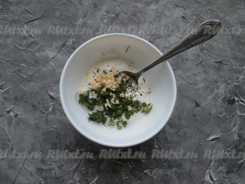 Для приготовления соуса смешать сметану, измельчённый укроп, мелко нарезанный чеснок, соль и перец.