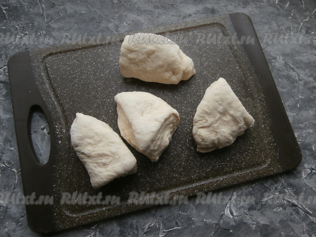 Каждую часть теста скатать в шарик, а затем на присыпанной мукой поверхности раскатать в лепёшку толщиной около 0,5 см.