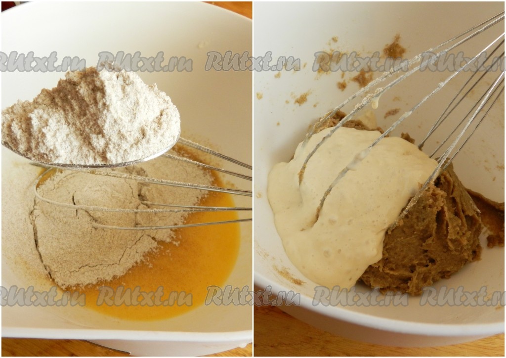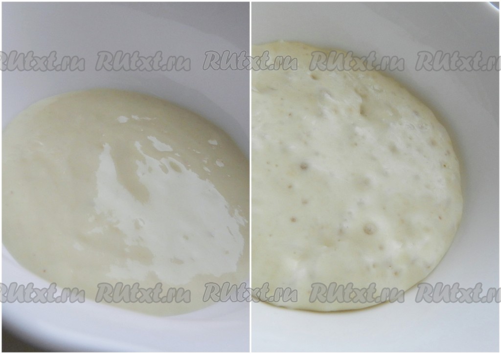 Приготовить опару. Для этого смешать муку и дрожжи, развести водой и оставить в теплом месте на 2,5-3 часа. Не беспокоить. Опара должна увеличиться в два раза, поверхность покрыться множеством пузырьков.
