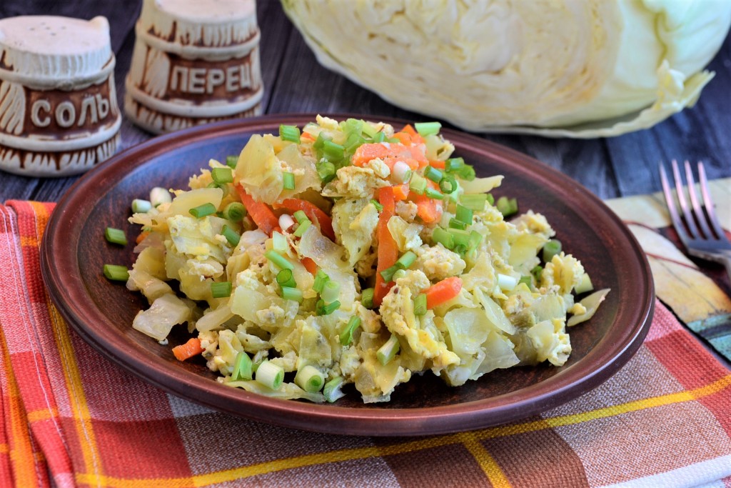 Подавать полезную и очень вкусную тушёную капусту, приготовленную с яйцами, нужно в горячем или тёплом виде, посыпав немного измельчённым зелёным луком.