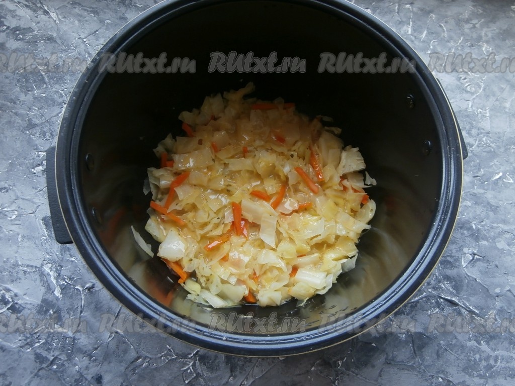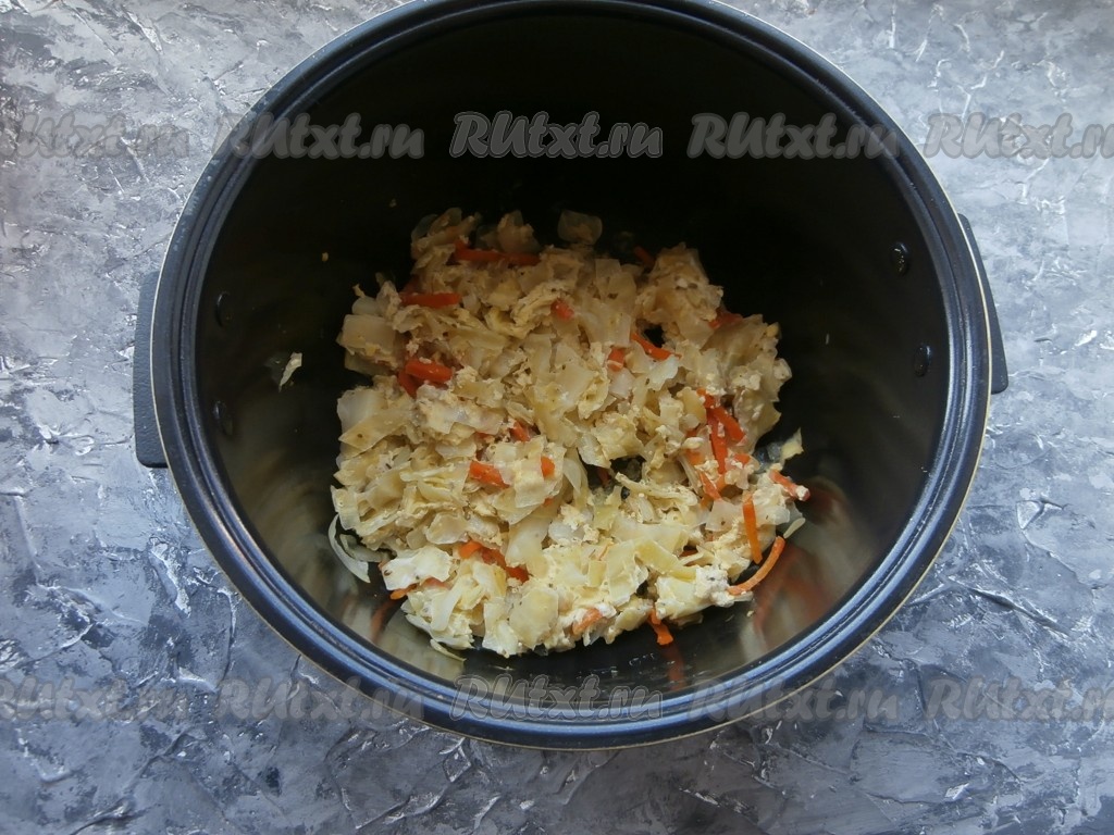 Когда программа "Тушение" завершится, залить капусту яйцами и выставить режим "Выпечка" на 5 минут. После этого оставить блюдо в мультиварке под закрытой крышкой на режиме "Подогрев" ещё на 10 минут.