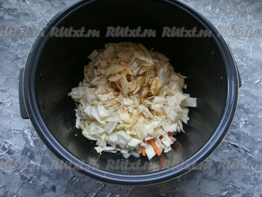 Добавить нарезанную на небольшие кусочки (или нашинкованную) капусту, всыпать соль, приправу для овощей и молотый чёрный перец. Ничего не перемешивать. Влить горячую воду, крышку мультиварки закрыть и выставить режим "Тушение" на 15 минут.