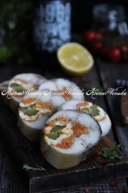 Нарезать фаршированную рыбу на кусочки и подать к столу. Вот такой красивый и очень яркий рулет из скумбрии по-царски получился. У него не только яркий запоминающийся вид, но и отменный вкус. Всем советую!