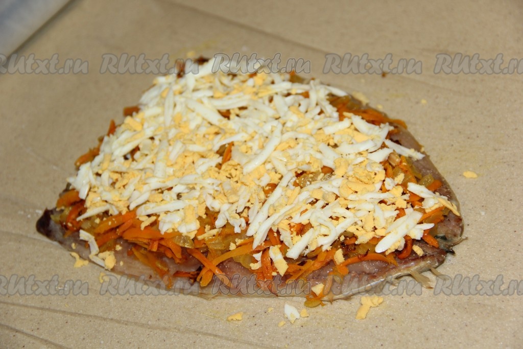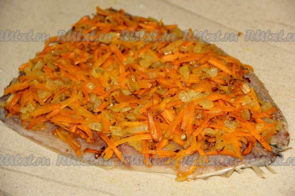 Выложить овощную начинку на филе скумбрии и равномерно распределить.