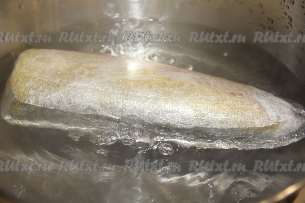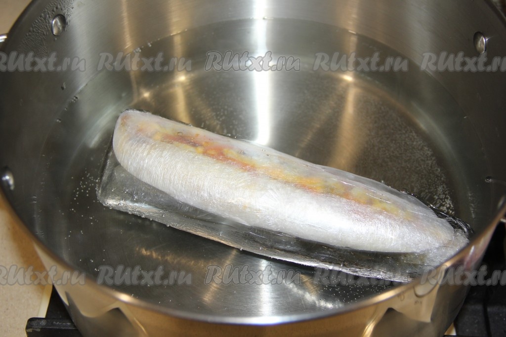 В кастрюлю влить воду и довести до кипения. Опустить фаршированную скумбрию в кипящую воду.