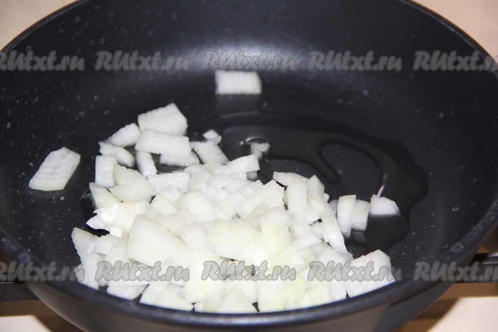 Влить немного масла в сковороду, добавить мелко нарезанный лук и обжарить его до золотистого цвета на среднем огне. В процессе обжаривания не забывайте перемешивать время от времени, чтобы лук не пригорел.