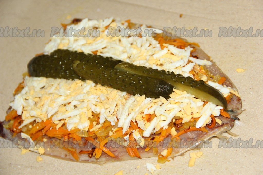 Маринованный огурец нарезать на длинные брусочки и выложить по середине филе.